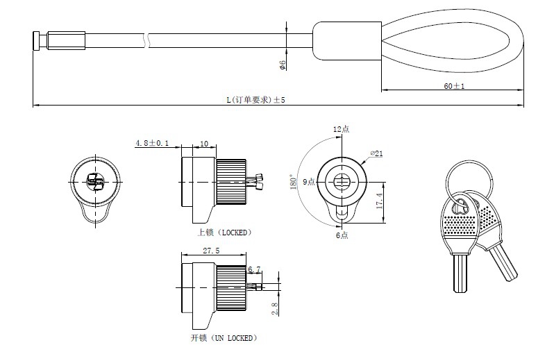 材質:鋅合金鎖體,銅鑰匙,纜繩為PVC+鋼絲