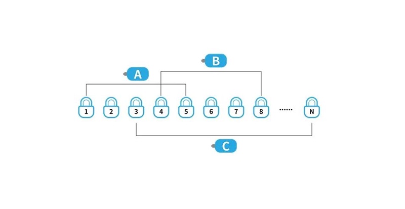 2.可開N把鎖可授權開一把或N把鎖具,便于零售店交叉管理。例如A鑰匙授權開1~5號鎖;B鑰匙授權開4~8號鎖;C鑰匙授權開3~N號鎖。每一位店員用一把鑰匙即可管理多臺展示設備。