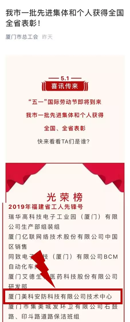 截至目前,美科安防共獲得福建省五一勞動獎1名,廈門市工人先鋒號1次,福建省工人先鋒號1次,廈門市五一勞動獎章2名。