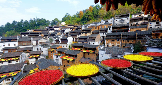 以“曬秋”聞名的婺源篁嶺民俗景區(qū),它被譽(yù)為中國最美符號(hào),周邊梯田覆疊白云環(huán)繞,村落整體形態(tài)依山傍水。