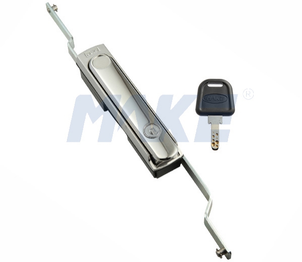 機柜鎖主要使用在機柜、工業機柜、電力電氣柜等柜體上,鎖住金屬板式柜或者機柜蓋件,鎖面與柜門保持平行,豎立安裝,設置在旋角空間上,縱向延伸,成型連桿。其中至少包括一個定位件,定位件為連桿靠近門板平面的另一個側面構成支承面,用于將柜門緊鎖在關閉位置時接受連桿,因此亦可稱為連桿鎖。美科安防科技有一款機柜鎖MK401,頂端雙向兩根連桿,因而被形象的稱為“天地連桿鎖”。