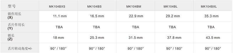 5種型號可選,分別是MK104BXS/MK104BS/ MK104BM/ MK104BL/ MK104BXL,保障工具柜與鎖的高適配性。