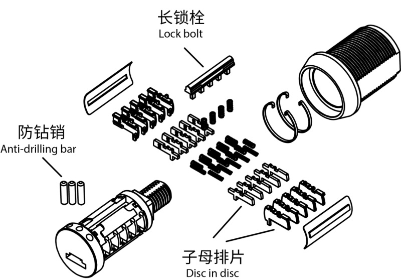 安全裝置M1在結構中增加安全裝置,增強防護水平。鎖芯側面配長鎖栓,鎖頭正面帶防鉆銷,防破壞性開啟。